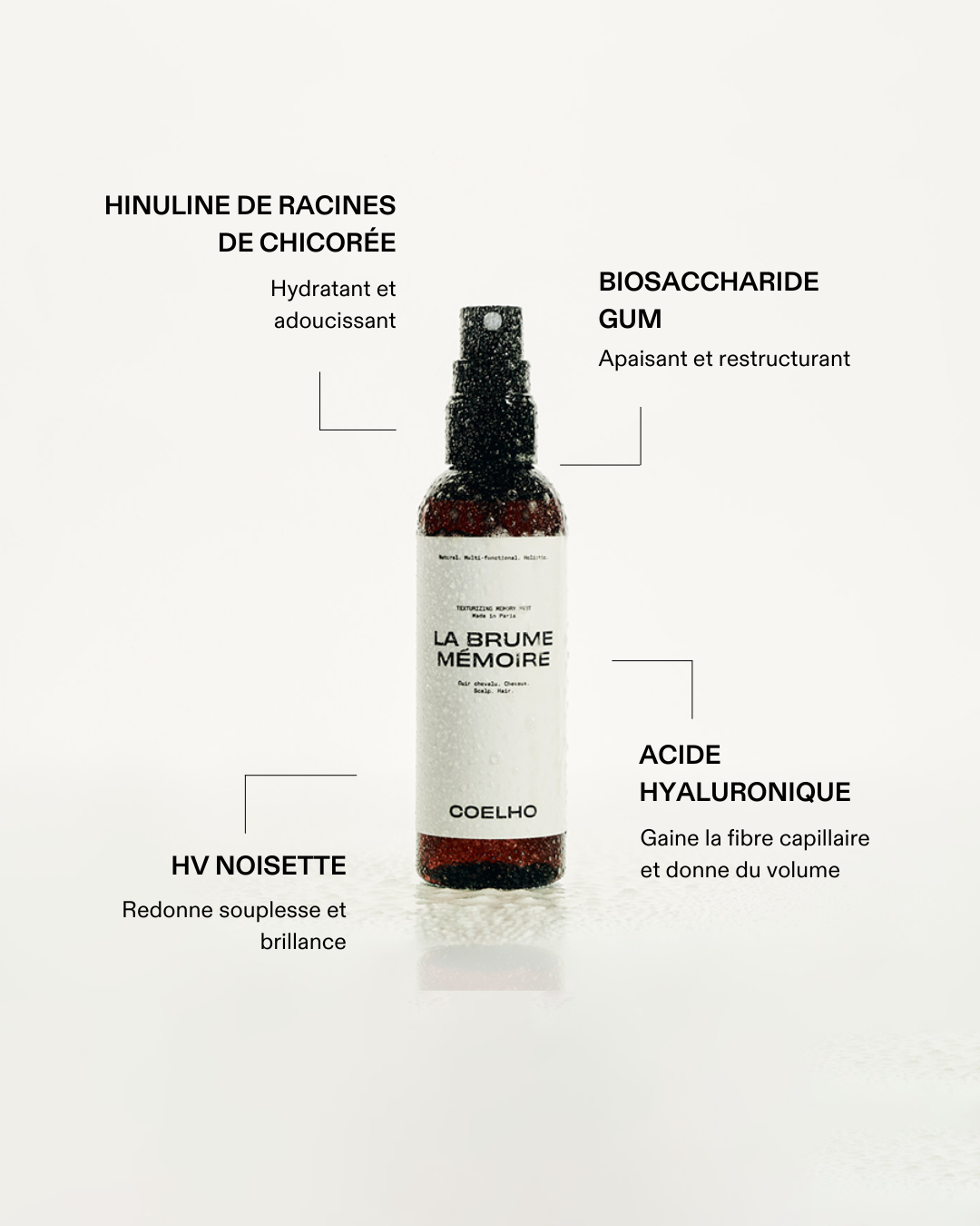 Une brume à la texture aérienne, pour des cheveux comme séchés par la brise. Une formule qui ne dessèche pas, hydrate sans alourdir, et préserve la mémoire des mouvements, des ondulations naturelles et du volume léger.